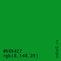 Цвет #089427 в цветовой модели RGB обозначается тремя октетами (8, 148, 39) в десятичном формате и #089427 в шестнадцатиричном (hex) формате, которые являются интенсивностью красного 8 (hex 08), интенсивность зелёного 148 (hex 94) и интенсивность синего 39 (hex 27).