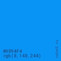 Цвет #0894F4 в цветовой модели RGB обозначается тремя октетами (8, 148, 244) в десятичном формате и #0894F4 в шестнадцатиричном (hex) формате, которые являются интенсивностью красного 8 (hex 08), интенсивность зелёного 148 (hex 94) и интенсивность синего 244 (hex F4).