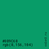 Цвет #089C68 в цветовой модели RGB обозначается тремя октетами (8, 156, 104) в десятичном формате и #089C68 в шестнадцатиричном (hex) формате, которые являются интенсивностью красного 8 (hex 08), интенсивность зелёного 156 (hex 9C) и интенсивность синего 104 (hex 68).