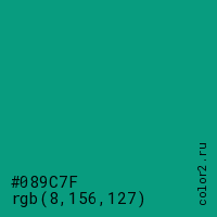 Цвет #089C7F в цветовой модели RGB обозначается тремя октетами (8, 156, 127) в десятичном формате и #089C7F в шестнадцатиричном (hex) формате, которые являются интенсивностью красного 8 (hex 08), интенсивность зелёного 156 (hex 9C) и интенсивность синего 127 (hex 7F).