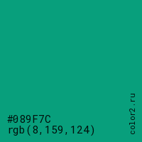 Цвет #089F7C в цветовой модели RGB обозначается тремя октетами (8, 159, 124) в десятичном формате и #089F7C в шестнадцатиричном (hex) формате, которые являются интенсивностью красного 8 (hex 08), интенсивность зелёного 159 (hex 9F) и интенсивность синего 124 (hex 7C).