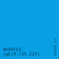 Цвет #089FE5 в цветовой модели RGB обозначается тремя октетами (8, 159, 229) в десятичном формате и #089FE5 в шестнадцатиричном (hex) формате, которые являются интенсивностью красного 8 (hex 08), интенсивность зелёного 159 (hex 9F) и интенсивность синего 229 (hex E5).