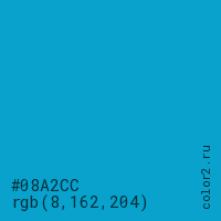 Цвет #08A2CC в цветовой модели RGB обозначается тремя октетами (8, 162, 204) в десятичном формате и #08A2CC в шестнадцатиричном (hex) формате, которые являются интенсивностью красного 8 (hex 08), интенсивность зелёного 162 (hex A2) и интенсивность синего 204 (hex CC).