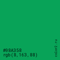 Цвет #08A358 в цветовой модели RGB обозначается тремя октетами (8, 163, 88) в десятичном формате и #08A358 в шестнадцатиричном (hex) формате, которые являются интенсивностью красного 8 (hex 08), интенсивность зелёного 163 (hex A3) и интенсивность синего 88 (hex 58).