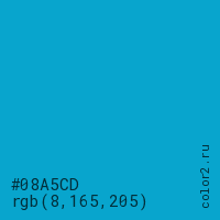 Цвет #08A5CD в цветовой модели RGB обозначается тремя октетами (8, 165, 205) в десятичном формате и #08A5CD в шестнадцатиричном (hex) формате, которые являются интенсивностью красного 8 (hex 08), интенсивность зелёного 165 (hex A5) и интенсивность синего 205 (hex CD).