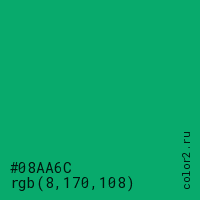 Цвет #08AA6C в цветовой модели RGB обозначается тремя октетами (8, 170, 108) в десятичном формате и #08AA6C в шестнадцатиричном (hex) формате, которые являются интенсивностью красного 8 (hex 08), интенсивность зелёного 170 (hex AA) и интенсивность синего 108 (hex 6C).
