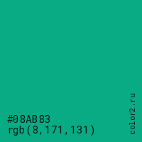 Цвет #08AB83 в цветовой модели RGB обозначается тремя октетами (8, 171, 131) в десятичном формате и #08AB83 в шестнадцатиричном (hex) формате, которые являются интенсивностью красного 8 (hex 08), интенсивность зелёного 171 (hex AB) и интенсивность синего 131 (hex 83).