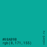 Цвет #08AB9B в цветовой модели RGB обозначается тремя октетами (8, 171, 155) в десятичном формате и #08AB9B в шестнадцатиричном (hex) формате, которые являются интенсивностью красного 8 (hex 08), интенсивность зелёного 171 (hex AB) и интенсивность синего 155 (hex 9B).