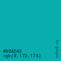 Цвет #08ADAE в цветовой модели RGB обозначается тремя октетами (8, 173, 174) в десятичном формате и #08ADAE в шестнадцатиричном (hex) формате, которые являются интенсивностью красного 8 (hex 08), интенсивность зелёного 173 (hex AD) и интенсивность синего 174 (hex AE).