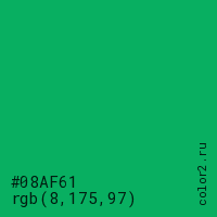 Цвет #08AF61 в цветовой модели RGB обозначается тремя октетами (8, 175, 97) в десятичном формате и #08AF61 в шестнадцатиричном (hex) формате, которые являются интенсивностью красного 8 (hex 08), интенсивность зелёного 175 (hex AF) и интенсивность синего 97 (hex 61).