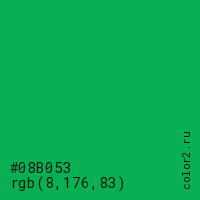 Цвет #08B053 в цветовой модели RGB обозначается тремя октетами (8, 176, 83) в десятичном формате и #08B053 в шестнадцатиричном (hex) формате, которые являются интенсивностью красного 8 (hex 08), интенсивность зелёного 176 (hex B0) и интенсивность синего 83 (hex 53).