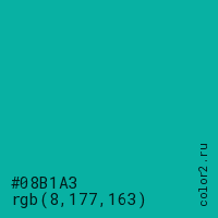 Цвет #08B1A3 в цветовой модели RGB обозначается тремя октетами (8, 177, 163) в десятичном формате и #08B1A3 в шестнадцатиричном (hex) формате, которые являются интенсивностью красного 8 (hex 08), интенсивность зелёного 177 (hex B1) и интенсивность синего 163 (hex A3).
