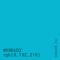 Цвет #08B6D2 в цветовой модели RGB обозначается тремя октетами (8, 182, 210) в десятичном формате и #08B6D2 в шестнадцатиричном (hex) формате, которые являются интенсивностью красного 8 (hex 08), интенсивность зелёного 182 (hex B6) и интенсивность синего 210 (hex D2).