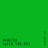 Цвет #08B720 в цветовой модели RGB обозначается тремя октетами (8, 183, 32) в десятичном формате и #08B720 в шестнадцатиричном (hex) формате, которые являются интенсивностью красного 8 (hex 08), интенсивность зелёного 183 (hex B7) и интенсивность синего 32 (hex 20).
