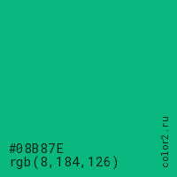 Цвет #08B87E в цветовой модели RGB обозначается тремя октетами (8, 184, 126) в десятичном формате и #08B87E в шестнадцатиричном (hex) формате, которые являются интенсивностью красного 8 (hex 08), интенсивность зелёного 184 (hex B8) и интенсивность синего 126 (hex 7E).