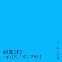 Цвет #08B8FD в цветовой модели RGB обозначается тремя октетами (8, 184, 253) в десятичном формате и #08B8FD в шестнадцатиричном (hex) формате, которые являются интенсивностью красного 8 (hex 08), интенсивность зелёного 184 (hex B8) и интенсивность синего 253 (hex FD).