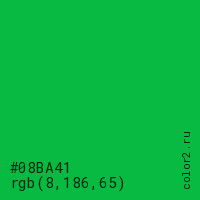 Цвет #08BA41 в цветовой модели RGB обозначается тремя октетами (8, 186, 65) в десятичном формате и #08BA41 в шестнадцатиричном (hex) формате, которые являются интенсивностью красного 8 (hex 08), интенсивность зелёного 186 (hex BA) и интенсивность синего 65 (hex 41).