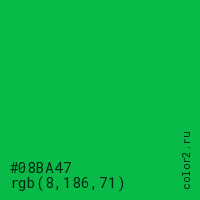 Цвет #08BA47 в цветовой модели RGB обозначается тремя октетами (8, 186, 71) в десятичном формате и #08BA47 в шестнадцатиричном (hex) формате, которые являются интенсивностью красного 8 (hex 08), интенсивность зелёного 186 (hex BA) и интенсивность синего 71 (hex 47).