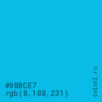 Цвет #08BCE7 в цветовой модели RGB обозначается тремя октетами (8, 188, 231) в десятичном формате и #08BCE7 в шестнадцатиричном (hex) формате, которые являются интенсивностью красного 8 (hex 08), интенсивность зелёного 188 (hex BC) и интенсивность синего 231 (hex E7).
