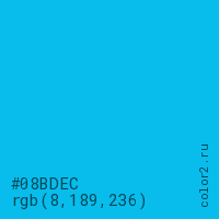 Цвет #08BDEC в цветовой модели RGB обозначается тремя октетами (8, 189, 236) в десятичном формате и #08BDEC в шестнадцатиричном (hex) формате, которые являются интенсивностью красного 8 (hex 08), интенсивность зелёного 189 (hex BD) и интенсивность синего 236 (hex EC).