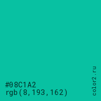 Цвет #08C1A2 в цветовой модели RGB обозначается тремя октетами (8, 193, 162) в десятичном формате и #08C1A2 в шестнадцатиричном (hex) формате, которые являются интенсивностью красного 8 (hex 08), интенсивность зелёного 193 (hex C1) и интенсивность синего 162 (hex A2).