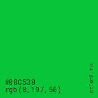 Цвет #08C538 в цветовой модели RGB обозначается тремя октетами (8, 197, 56) в десятичном формате и #08C538 в шестнадцатиричном (hex) формате, которые являются интенсивностью красного 8 (hex 08), интенсивность зелёного 197 (hex C5) и интенсивность синего 56 (hex 38).