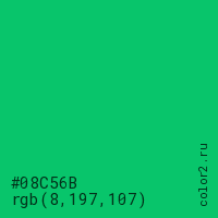 Цвет #08C56B в цветовой модели RGB обозначается тремя октетами (8, 197, 107) в десятичном формате и #08C56B в шестнадцатиричном (hex) формате, которые являются интенсивностью красного 8 (hex 08), интенсивность зелёного 197 (hex C5) и интенсивность синего 107 (hex 6B).