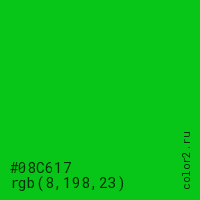 Цвет #08C617 в цветовой модели RGB обозначается тремя октетами (8, 198, 23) в десятичном формате и #08C617 в шестнадцатиричном (hex) формате, которые являются интенсивностью красного 8 (hex 08), интенсивность зелёного 198 (hex C6) и интенсивность синего 23 (hex 17).