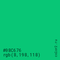 Цвет #08C676 в цветовой модели RGB обозначается тремя октетами (8, 198, 118) в десятичном формате и #08C676 в шестнадцатиричном (hex) формате, которые являются интенсивностью красного 8 (hex 08), интенсивность зелёного 198 (hex C6) и интенсивность синего 118 (hex 76).