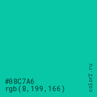Цвет #08C7A6 в цветовой модели RGB обозначается тремя октетами (8, 199, 166) в десятичном формате и #08C7A6 в шестнадцатиричном (hex) формате, которые являются интенсивностью красного 8 (hex 08), интенсивность зелёного 199 (hex C7) и интенсивность синего 166 (hex A6).