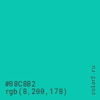 Цвет #08C8B2 в цветовой модели RGB обозначается тремя октетами (8, 200, 178) в десятичном формате и #08C8B2 в шестнадцатиричном (hex) формате, которые являются интенсивностью красного 8 (hex 08), интенсивность зелёного 200 (hex C8) и интенсивность синего 178 (hex B2).