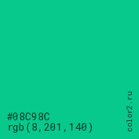 Цвет #08C98C в цветовой модели RGB обозначается тремя октетами (8, 201, 140) в десятичном формате и #08C98C в шестнадцатиричном (hex) формате, которые являются интенсивностью красного 8 (hex 08), интенсивность зелёного 201 (hex C9) и интенсивность синего 140 (hex 8C).
