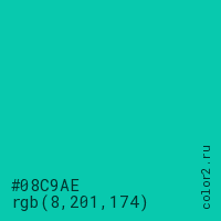 Цвет #08C9AE в цветовой модели RGB обозначается тремя октетами (8, 201, 174) в десятичном формате и #08C9AE в шестнадцатиричном (hex) формате, которые являются интенсивностью красного 8 (hex 08), интенсивность зелёного 201 (hex C9) и интенсивность синего 174 (hex AE).