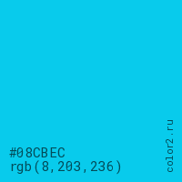 Цвет #08CBEC в цветовой модели RGB обозначается тремя октетами (8, 203, 236) в десятичном формате и #08CBEC в шестнадцатиричном (hex) формате, которые являются интенсивностью красного 8 (hex 08), интенсивность зелёного 203 (hex CB) и интенсивность синего 236 (hex EC).