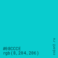 Цвет #08CCCE в цветовой модели RGB обозначается тремя октетами (8, 204, 206) в десятичном формате и #08CCCE в шестнадцатиричном (hex) формате, которые являются интенсивностью красного 8 (hex 08), интенсивность зелёного 204 (hex CC) и интенсивность синего 206 (hex CE).