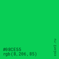 Цвет #08CE55 в цветовой модели RGB обозначается тремя октетами (8, 206, 85) в десятичном формате и #08CE55 в шестнадцатиричном (hex) формате, которые являются интенсивностью красного 8 (hex 08), интенсивность зелёного 206 (hex CE) и интенсивность синего 85 (hex 55).