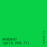 Цвет #08D047 в цветовой модели RGB обозначается тремя октетами (8, 208, 71) в десятичном формате и #08D047 в шестнадцатиричном (hex) формате, которые являются интенсивностью красного 8 (hex 08), интенсивность зелёного 208 (hex D0) и интенсивность синего 71 (hex 47).