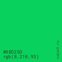 Цвет #08D25D в цветовой модели RGB обозначается тремя октетами (8, 210, 93) в десятичном формате и #08D25D в шестнадцатиричном (hex) формате, которые являются интенсивностью красного 8 (hex 08), интенсивность зелёного 210 (hex D2) и интенсивность синего 93 (hex 5D).