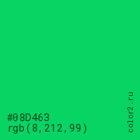 Цвет #08D463 в цветовой модели RGB обозначается тремя октетами (8, 212, 99) в десятичном формате и #08D463 в шестнадцатиричном (hex) формате, которые являются интенсивностью красного 8 (hex 08), интенсивность зелёного 212 (hex D4) и интенсивность синего 99 (hex 63).