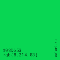Цвет #08D653 в цветовой модели RGB обозначается тремя октетами (8, 214, 83) в десятичном формате и #08D653 в шестнадцатиричном (hex) формате, которые являются интенсивностью красного 8 (hex 08), интенсивность зелёного 214 (hex D6) и интенсивность синего 83 (hex 53).