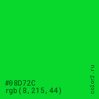 Цвет #08D72C в цветовой модели RGB обозначается тремя октетами (8, 215, 44) в десятичном формате и #08D72C в шестнадцатиричном (hex) формате, которые являются интенсивностью красного 8 (hex 08), интенсивность зелёного 215 (hex D7) и интенсивность синего 44 (hex 2C).