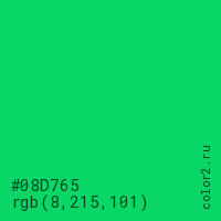 Цвет #08D765 в цветовой модели RGB обозначается тремя октетами (8, 215, 101) в десятичном формате и #08D765 в шестнадцатиричном (hex) формате, которые являются интенсивностью красного 8 (hex 08), интенсивность зелёного 215 (hex D7) и интенсивность синего 101 (hex 65).