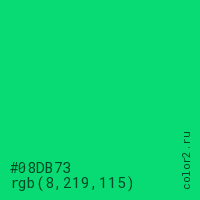 Цвет #08DB73 в цветовой модели RGB обозначается тремя октетами (8, 219, 115) в десятичном формате и #08DB73 в шестнадцатиричном (hex) формате, которые являются интенсивностью красного 8 (hex 08), интенсивность зелёного 219 (hex DB) и интенсивность синего 115 (hex 73).