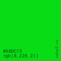 Цвет #08DC15 в цветовой модели RGB обозначается тремя октетами (8, 220, 21) в десятичном формате и #08DC15 в шестнадцатиричном (hex) формате, которые являются интенсивностью красного 8 (hex 08), интенсивность зелёного 220 (hex DC) и интенсивность синего 21 (hex 15).