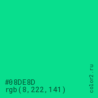 Цвет #08DE8D в цветовой модели RGB обозначается тремя октетами (8, 222, 141) в десятичном формате и #08DE8D в шестнадцатиричном (hex) формате, которые являются интенсивностью красного 8 (hex 08), интенсивность зелёного 222 (hex DE) и интенсивность синего 141 (hex 8D).
