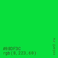 Цвет #08DF3C в цветовой модели RGB обозначается тремя октетами (8, 223, 60) в десятичном формате и #08DF3C в шестнадцатиричном (hex) формате, которые являются интенсивностью красного 8 (hex 08), интенсивность зелёного 223 (hex DF) и интенсивность синего 60 (hex 3C).