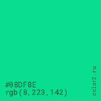Цвет #08DF8E в цветовой модели RGB обозначается тремя октетами (8, 223, 142) в десятичном формате и #08DF8E в шестнадцатиричном (hex) формате, которые являются интенсивностью красного 8 (hex 08), интенсивность зелёного 223 (hex DF) и интенсивность синего 142 (hex 8E).