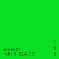 Цвет #08E021 в цветовой модели RGB обозначается тремя октетами (8, 224, 33) в десятичном формате и #08E021 в шестнадцатиричном (hex) формате, которые являются интенсивностью красного 8 (hex 08), интенсивность зелёного 224 (hex E0) и интенсивность синего 33 (hex 21).