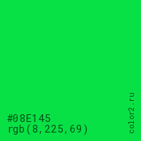Цвет #08E145 в цветовой модели RGB обозначается тремя октетами (8, 225, 69) в десятичном формате и #08E145 в шестнадцатиричном (hex) формате, которые являются интенсивностью красного 8 (hex 08), интенсивность зелёного 225 (hex E1) и интенсивность синего 69 (hex 45).