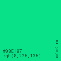 Цвет #08E187 в цветовой модели RGB обозначается тремя октетами (8, 225, 135) в десятичном формате и #08E187 в шестнадцатиричном (hex) формате, которые являются интенсивностью красного 8 (hex 08), интенсивность зелёного 225 (hex E1) и интенсивность синего 135 (hex 87).